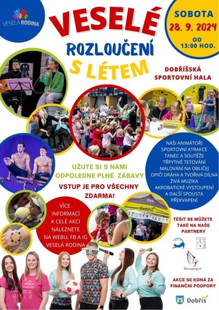 Již po čtvrté se na Dobříši ve sportovní hale koná Veselé rozloučení s létem. Přijďte a užijte si odpoledne plné živé hudby, tancování, soutěží, interaktivních stanovišť, zajímavých vystoupení a spoustu další zábavy! Velcí i malí, holky i kluci, každý si najde to své!